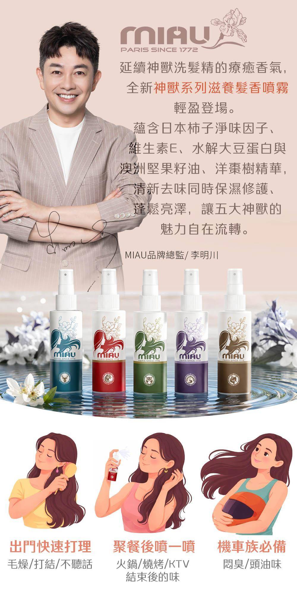 延續神獸洗髮精的療癒香氣,全新髮香噴霧輕盈登場。蘊含日本柿子淨味因子、維生素E、水解大豆蛋白與澳洲堅果籽油、洋棗樹精華,清新去味同時保濕修護、蓬鬆亮澤,讓狐狸、貓頭鷹、孔雀、花豹、公鹿的魅力自在流轉。